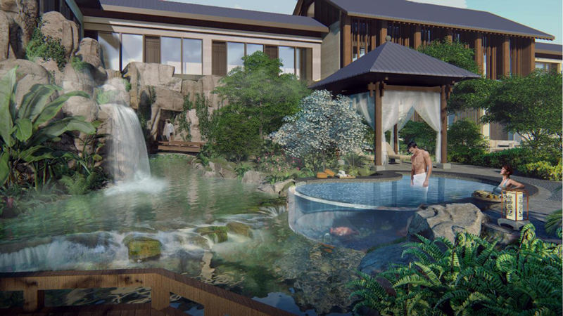 綠沁團隊因地制宜設計約1.2萬㎡溫泉中心,約1.8萬㎡溫泉酒店(含貴賓樓),約2萬㎡室內外溫泉泡池、約6千㎡會務娛樂配套。