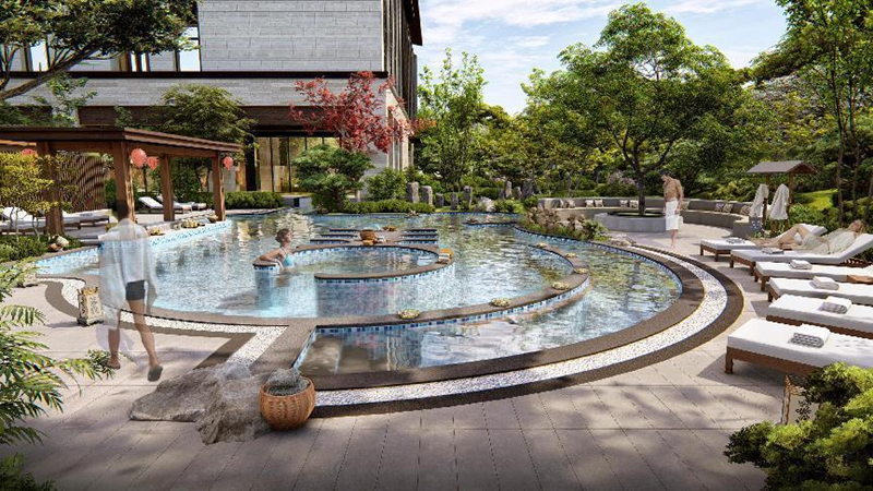湖北荊門雙泉溫泉項目秉持打造“國內城市溫泉休閑綜合體標桿、湖北首家五星級溫泉標準”的建設理念,是集沉浸式溫泉體驗、五星級酒店、網紅打卡、商務接待于一體的城市溫泉休閑綜合體。綠沁集團擔綱本項目的策劃及顧問、室內設計、溫泉景觀設計、機電管網設計、管理運營的工作。
