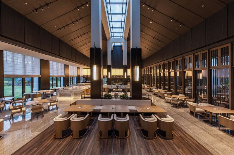酒店的溫泉中心融合唐風元素,一樓設有接待大廳、泳裝商場、更衣區、裸湯區、干、濕蒸,搓背區、淋浴區等滿足游客的各種需求。綠沁團隊運用泉水與自然相互融合的設計理念,打造出唐風魅力的東方韻味。